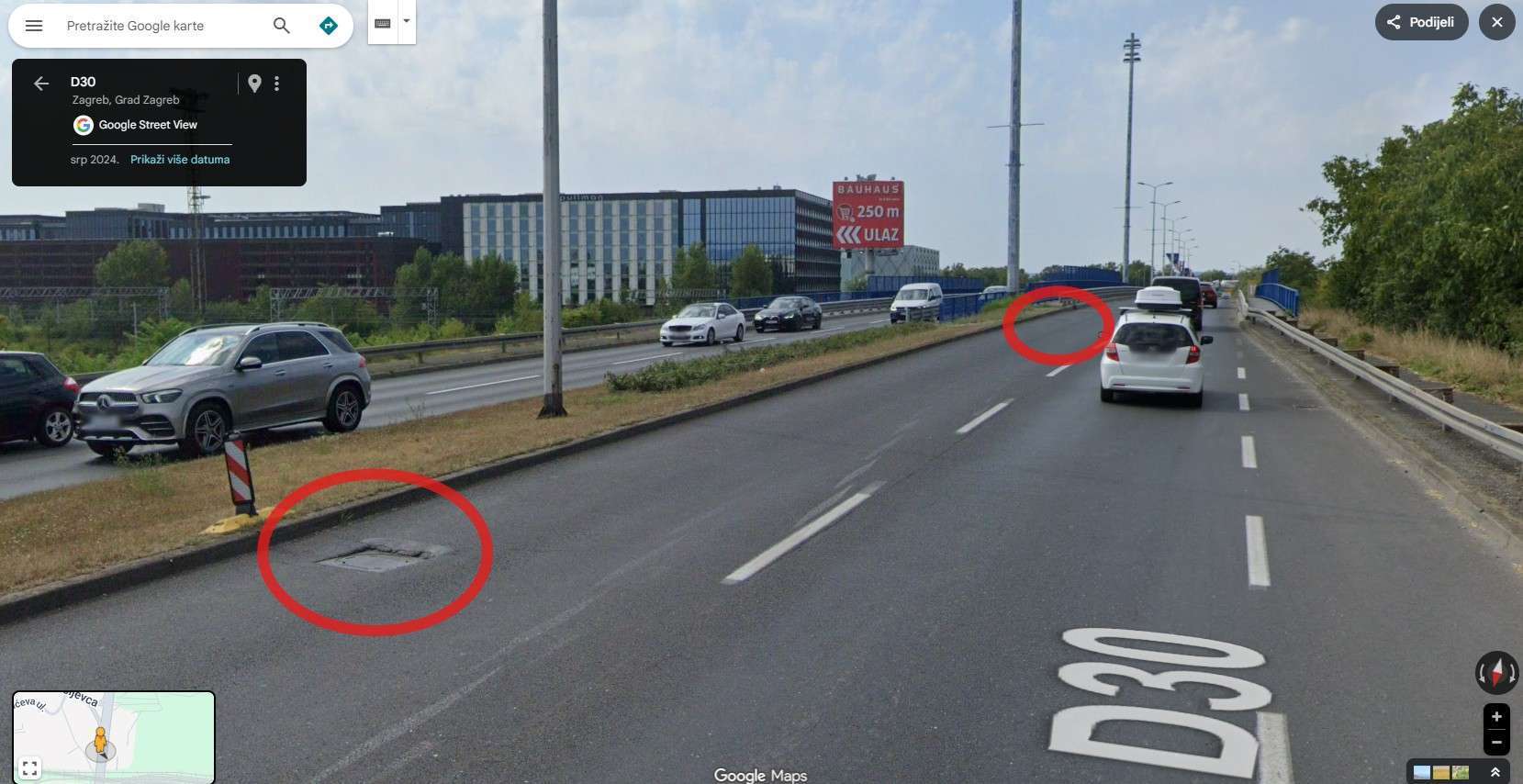 Dva ulehnuta šahta u lijevoj traci smjer jug Avenija Većeslava Holjevca prije nadvožnjaka pruge, smjer jug
