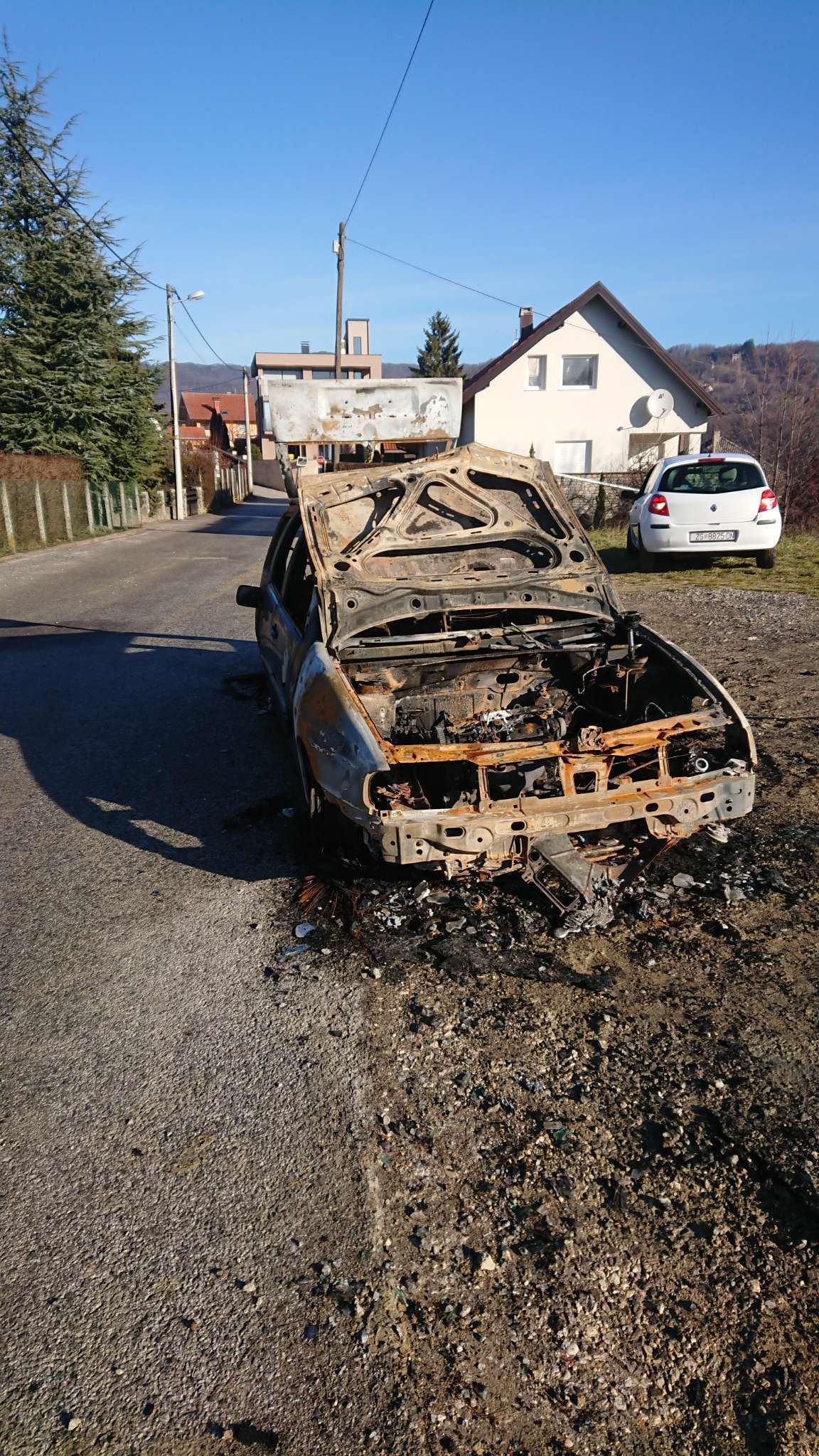 Zapaljeni ostavljeni auto uz cestu sjeveroistočno od brane na Bidrovcu